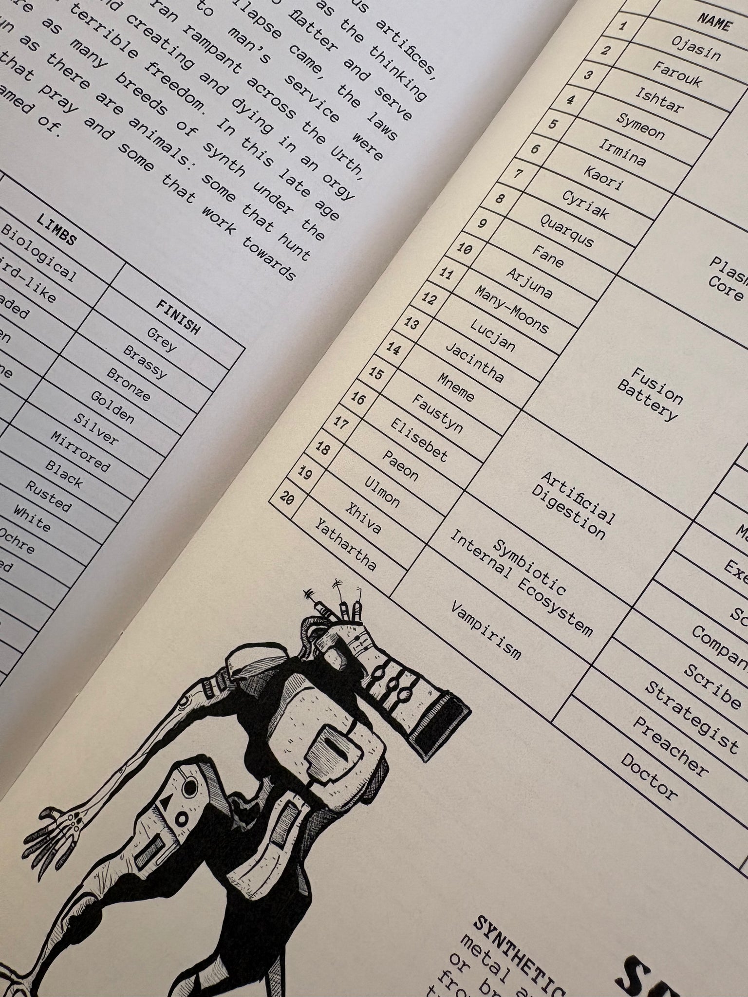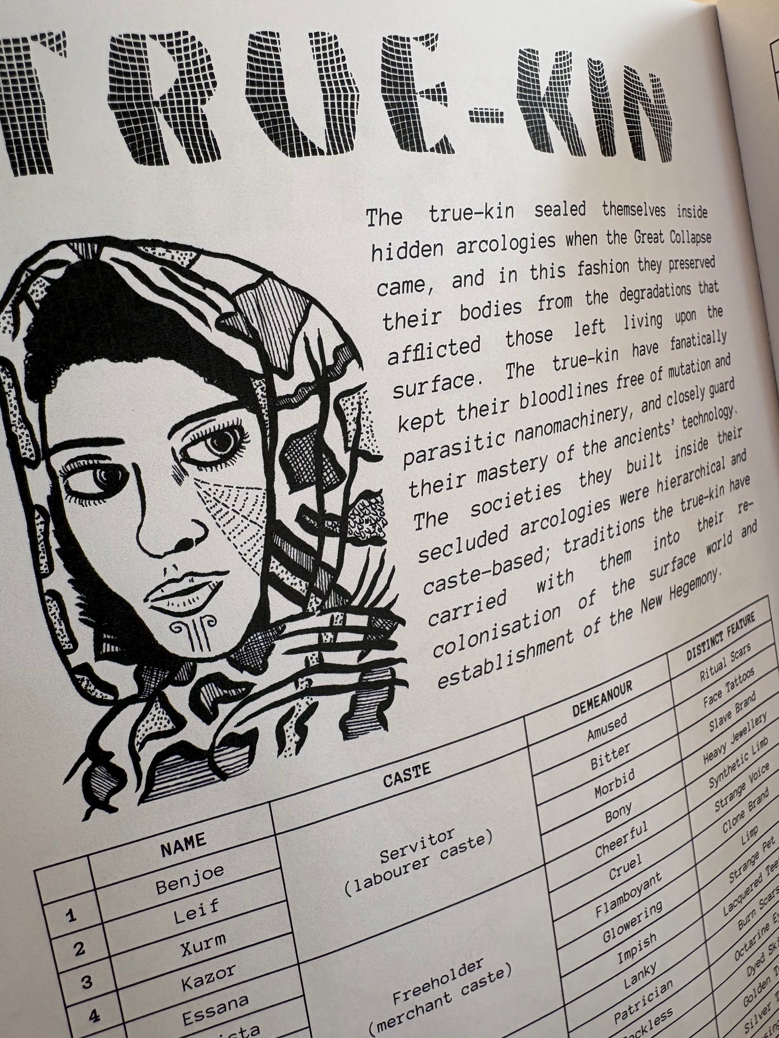 - Five player ancestries with detailed character generation tables. Play as a haughty true-kin, a mutated cacogen, a mechanical synth, a feral newbeast, or a fungal mycomorph.